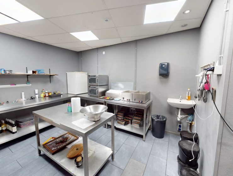 Gezien de locatie zijn hier volop mogelijkheden voor een snelle service en kan het assortiment eenvoudig worden uitgebreid. De ruimte is geschikt om aanverwante producten te verkopen zoals het bereiden van pizza’s. Deze ruimte en locatie leent zich ook om te gebruiken als productiekeuken voor cateringactiviteiten.