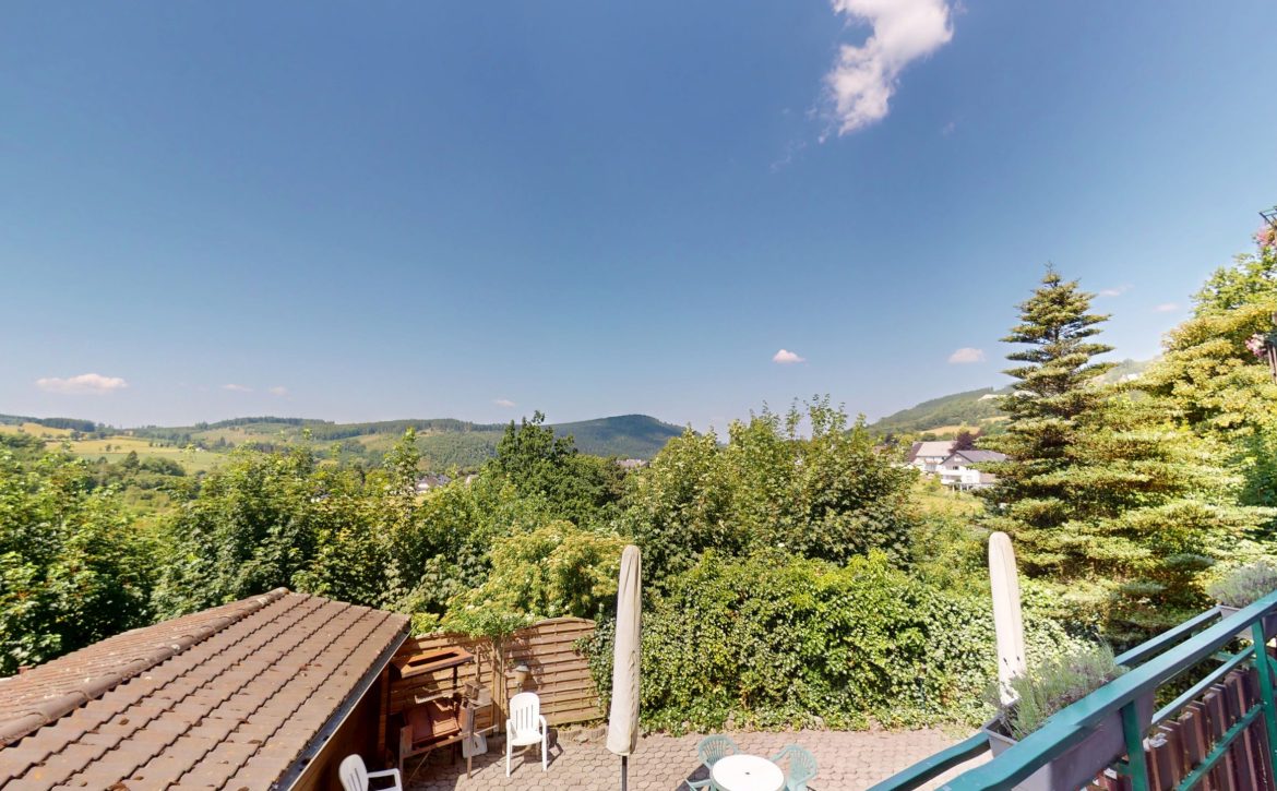 Gelegen op een panoramische helling boven Hildfeld, met uitzicht op de Rothaarberg en het dorpje Hildfeld (~480 inwoners op 605 m hoogte).