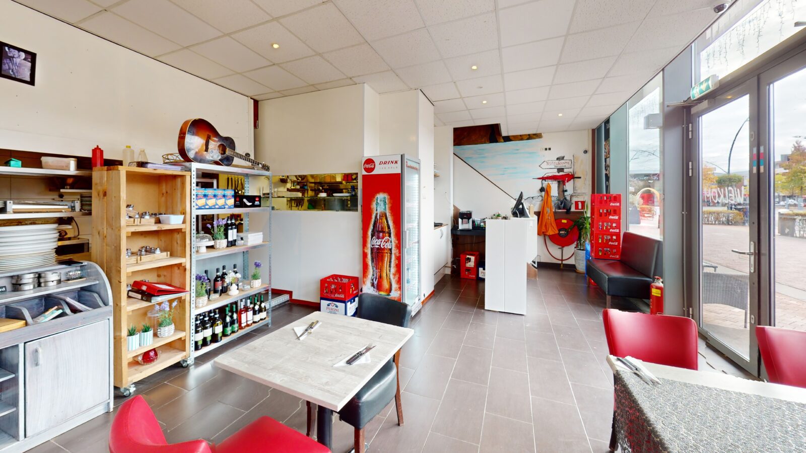 De horecaruimte is verdeeld over twee verdiepingen en wordt gekenmerkt door stijlvolle zuilen, grote raampartijen en een moderne uitstraling. Op de begane grond bevindt zich een ruime, functioneel ingerichte keuken met een directe doorloop naar de aparte spoelkeuken. De eerste verdieping biedt plaats aan circa 40 gasten en beschikt over een prettig uitzicht over het plein. Tevens zijn hier twee nette toiletgroepen aanwezig.
